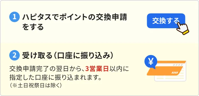 ハピタスから直接、指定の口座に現金を振り込みます。金融機関コード(全銀協コード)が付与された各種金融機関に振込が可能です。